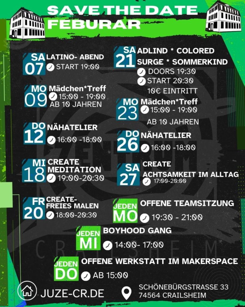 Kommt vorbei, bringt eure Leute mit und lasst uns gemeinsam das JuZe zum Beben bringen.